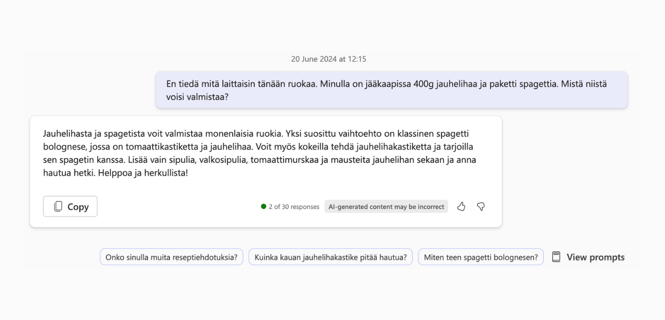 Ensimmäinen kysymys on nyt kysytty. Kysytäänpä Copilotilta apua arkiseen ongelmaan. ”En tiedä mitä laittaisin tänään ruokaa. Minulla on jääkaapissa 400g jauhelihaa ja paketti spagettia. Mistä niistä voisi valmistaa?”