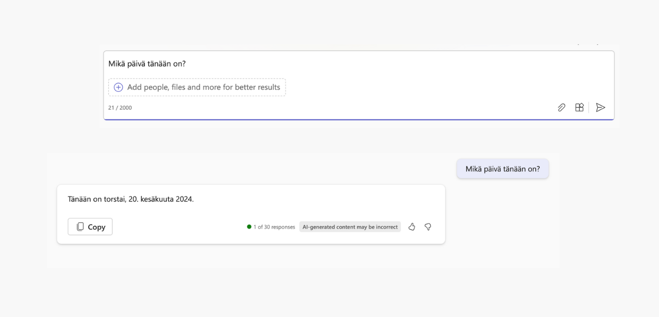 Sitten on ensimmäisen kysymyksen/ promptin aika. Vaikka käyttäjän MS Teams on englanninkielinen, voi kysymyksen esittää suomeksi.